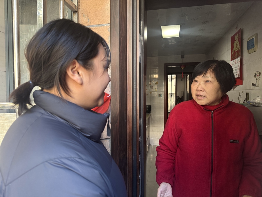 徐房物业养老服务专员(左)向田林新村老年居民了解服务情况。舒抒 摄
