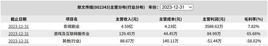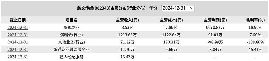 此外,慈文传媒的游戏业务收入从2023年129.45万元锐减86.32%至2024年17.7万元,仅占总收入0.05%;演唱会业务2024年虽实现1213.65万元收入,但毛利率极低仅91万元,对盈利贡献可忽略不计。
